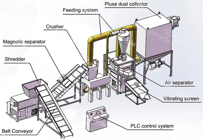 Through shredding, crushing, vibration screening, (the incompletely separated metal and nonmetal will reentry into the crushing machine and be crushed again) gravity separating, electrostatic separating and pulse dust collecting, the separation rate of the copper and plastic will reach about 99% , eventually get metal and non-metallic collective.